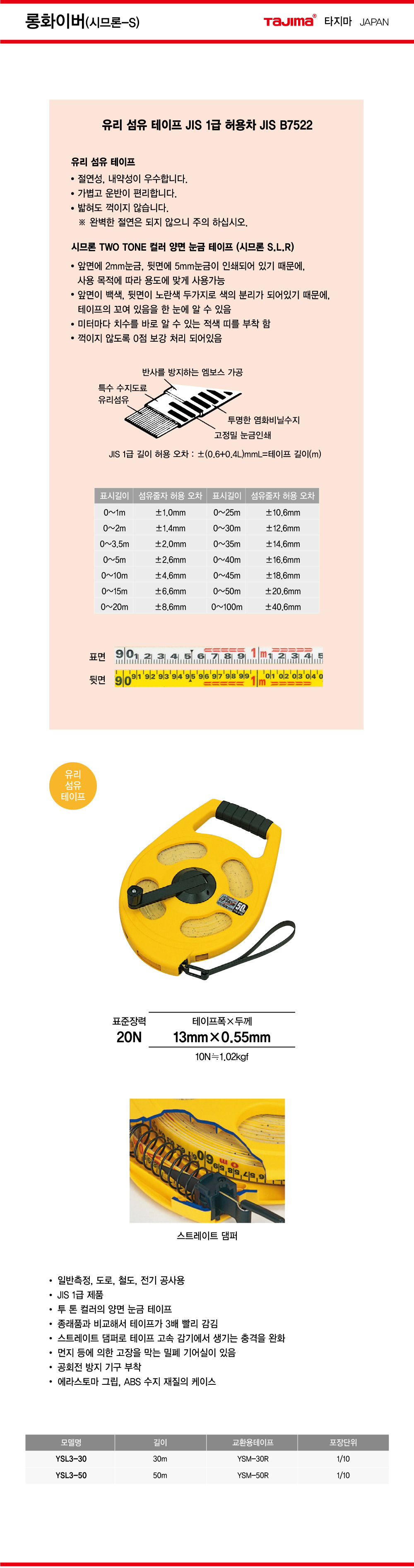 | 품명/모델명 | 타지마 줄자 화이바 YSL3-30 30M / 옵션별 모델명 참조 |